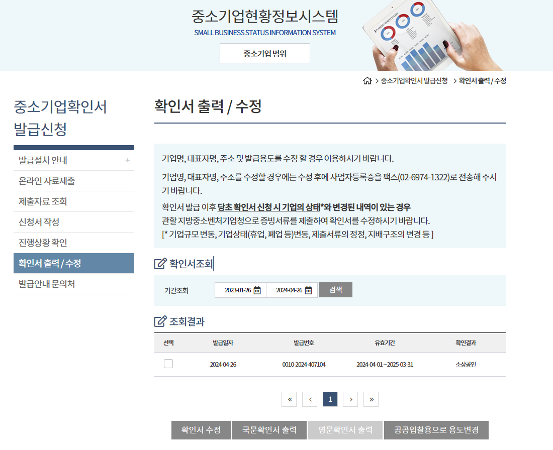 중소기업확인서 발급신청 - 확인서 출력