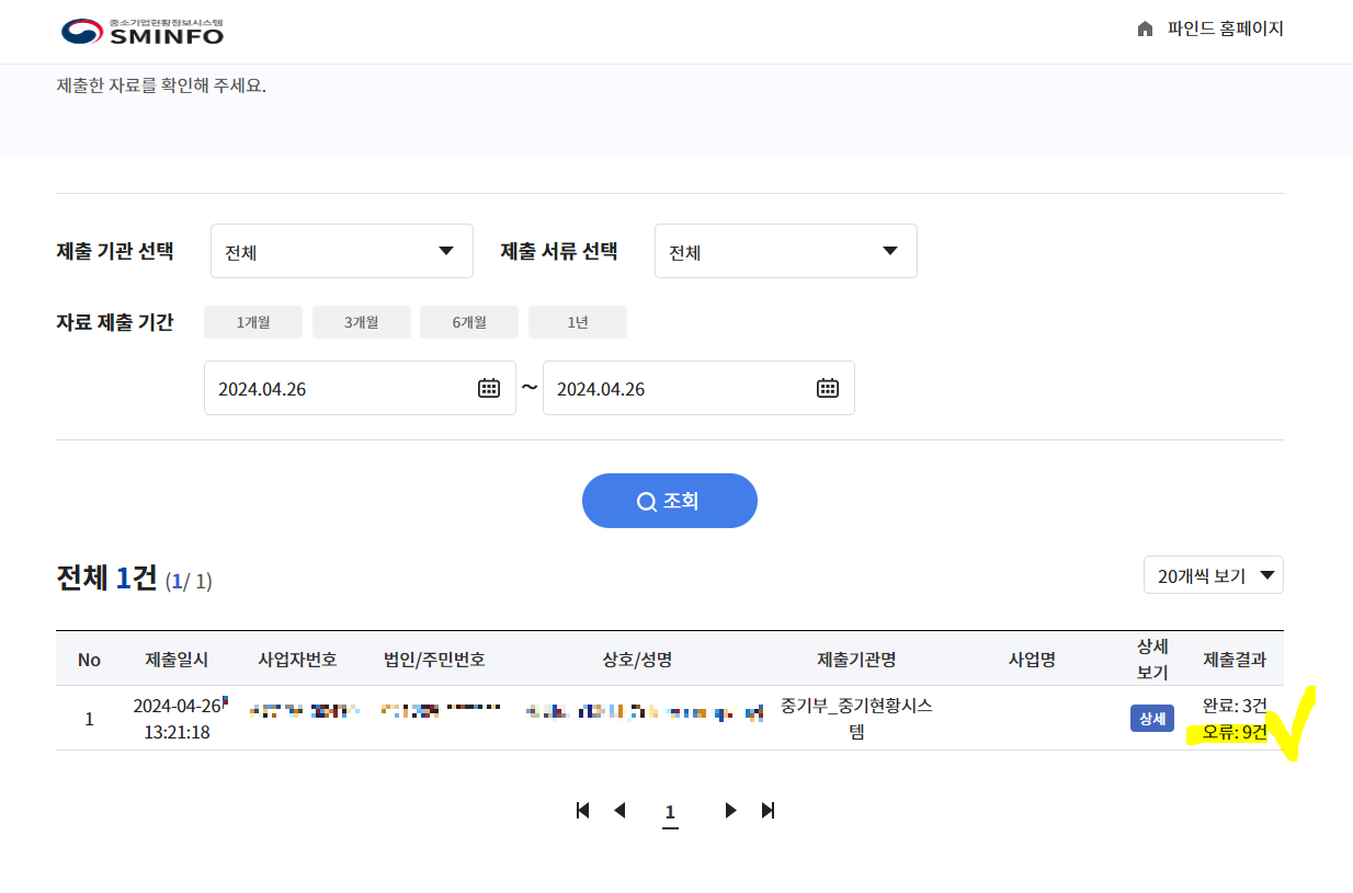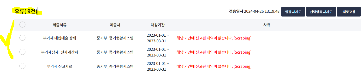 온라인 자료 제출결과가 오류 9건으로