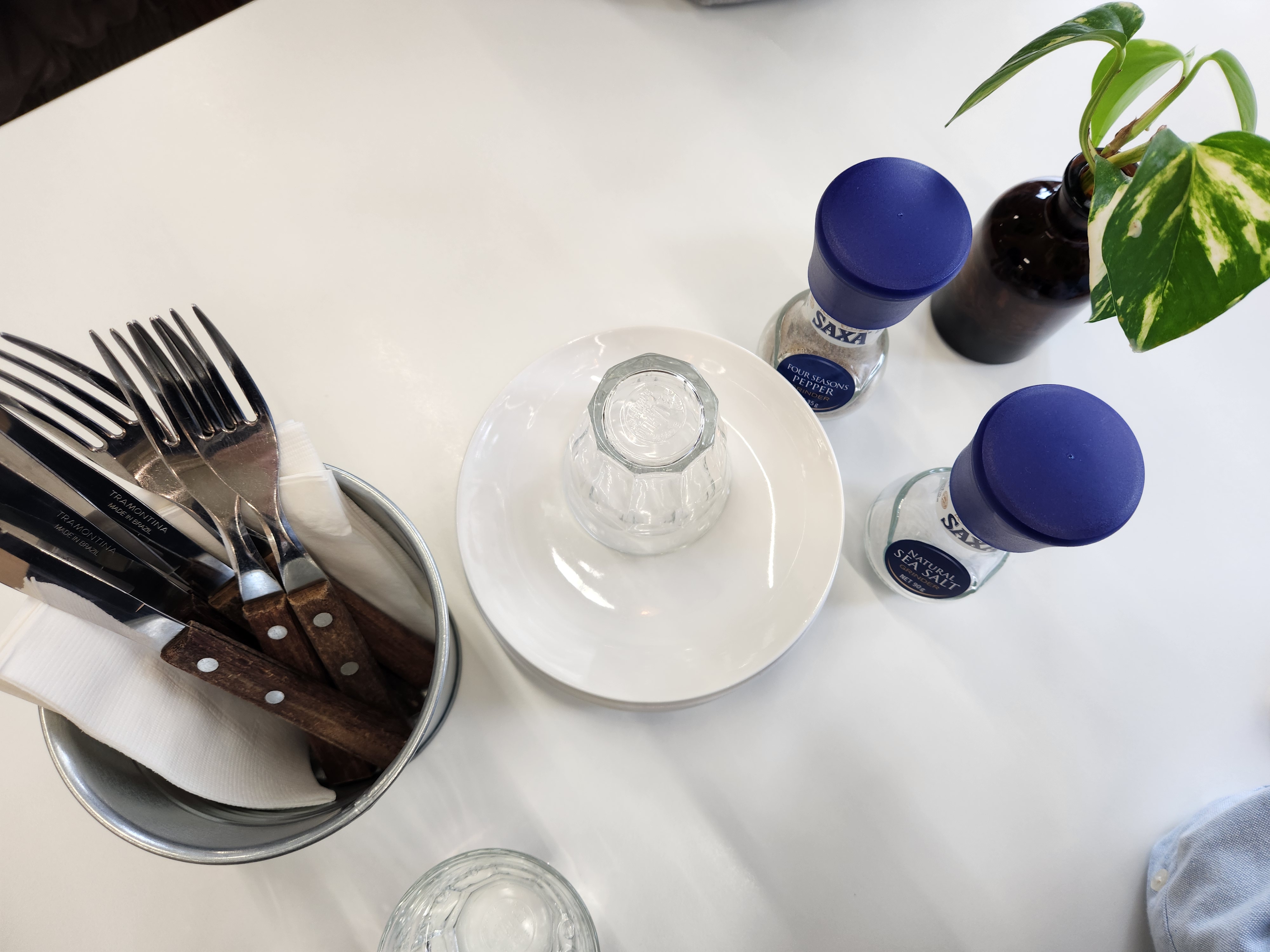 테이블에는 식기와 후추, 소금이 준비되어 있습니다.