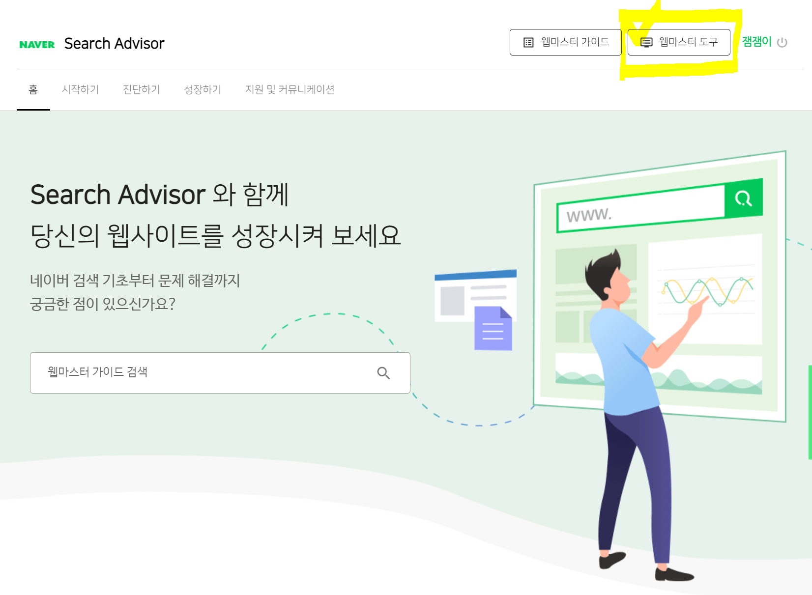 네이버 아이디로 로그인 후 우상단의 웹마스터 도구를 클릭하여