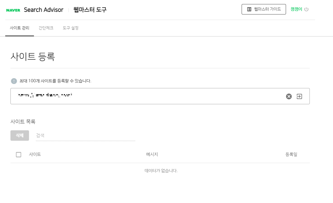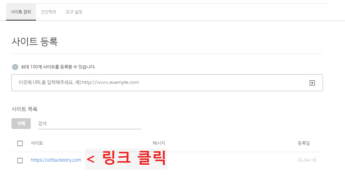 그리고 사이트 등록을 진행해줍니다. 당연히, 노출시키고 싶었던 내 티스토리 블로그 url을 가져와 칸에 입력합니다.