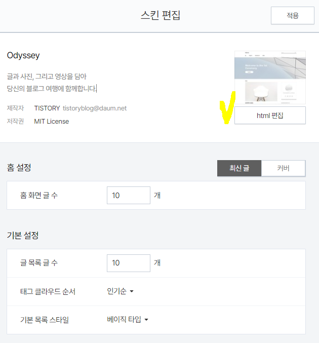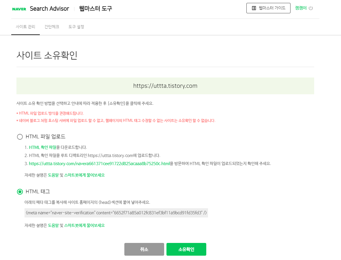 사이트 소유가 맞는지를 확인해야합니다. 확인하는 방법은 HTML 태그를 스킨 편집 버튼을 눌러 넣어주는 것인데요!