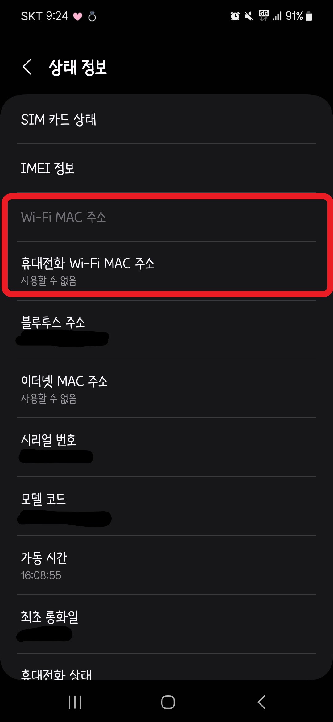 ④ 휴대전화 WIFI MAC 주소 : '사용할 수 없음'으로 뜰 때