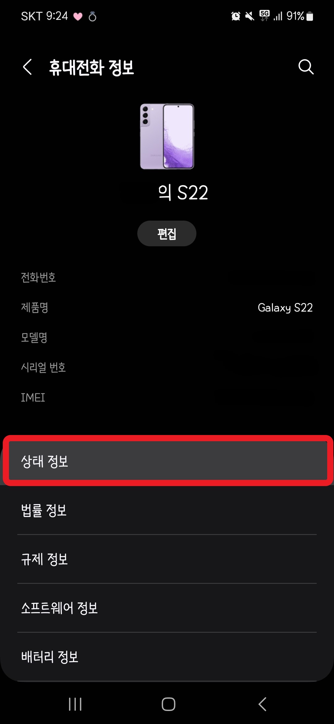 내 휴대전화 정보가 쭉 뜨는데, 여기서 맨 윗 칸에 있는 '상태 정보'로 들어갑니다.