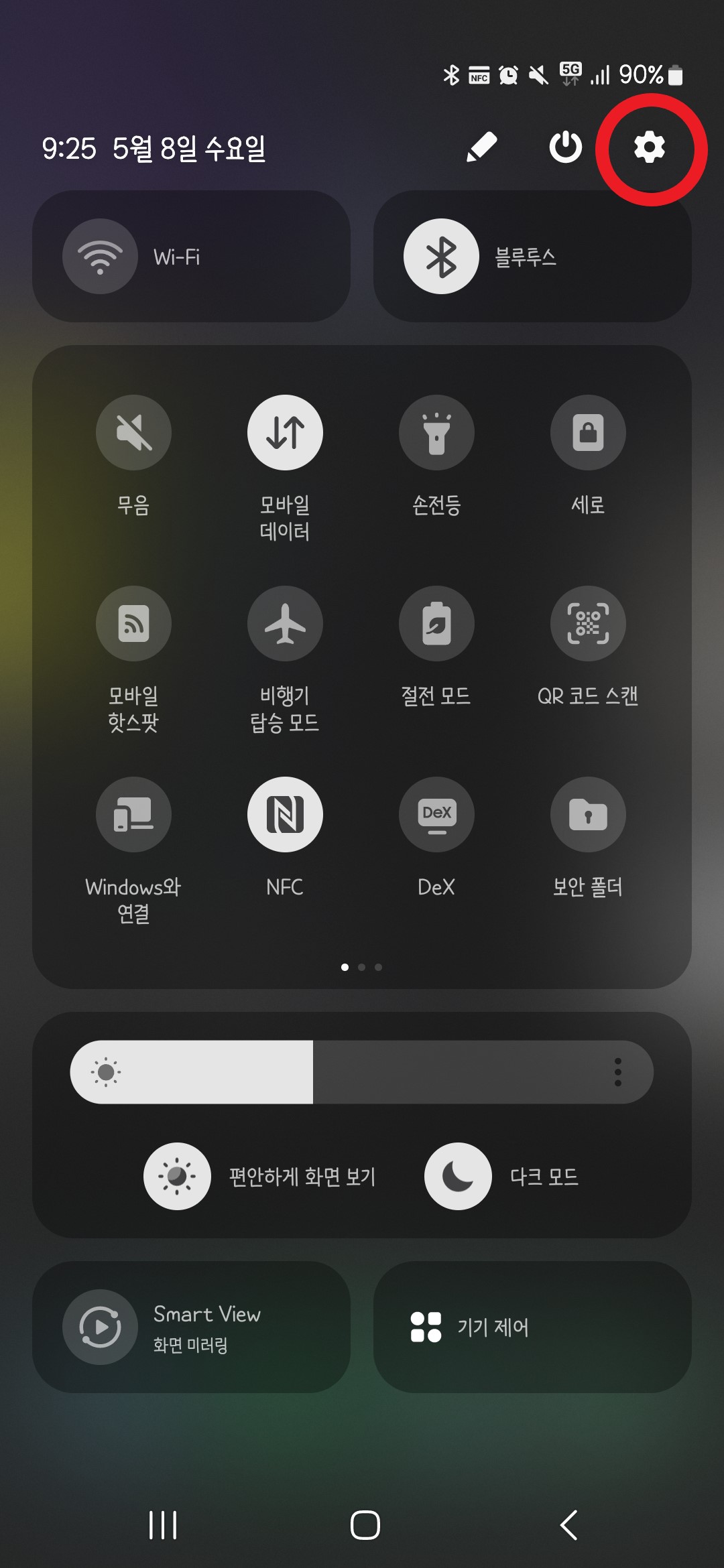 사진은 배경화면의 최상단 바를 아래로 드래그해서 나오는 화면이에요.
