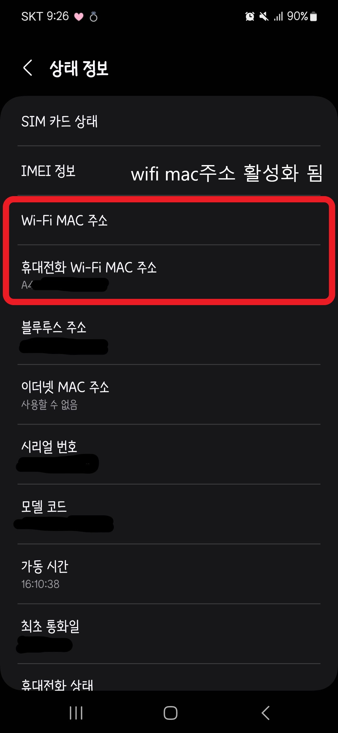 휴대전화 와이파이 맥 주소가 활성화된 것을 확인할 수 있습니다.