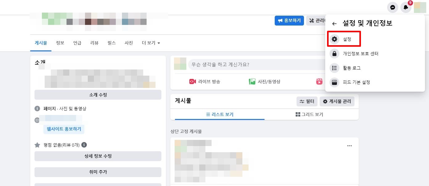1) 페이스북 페이지로 접속 - '설정 및 개인정보' 클릭