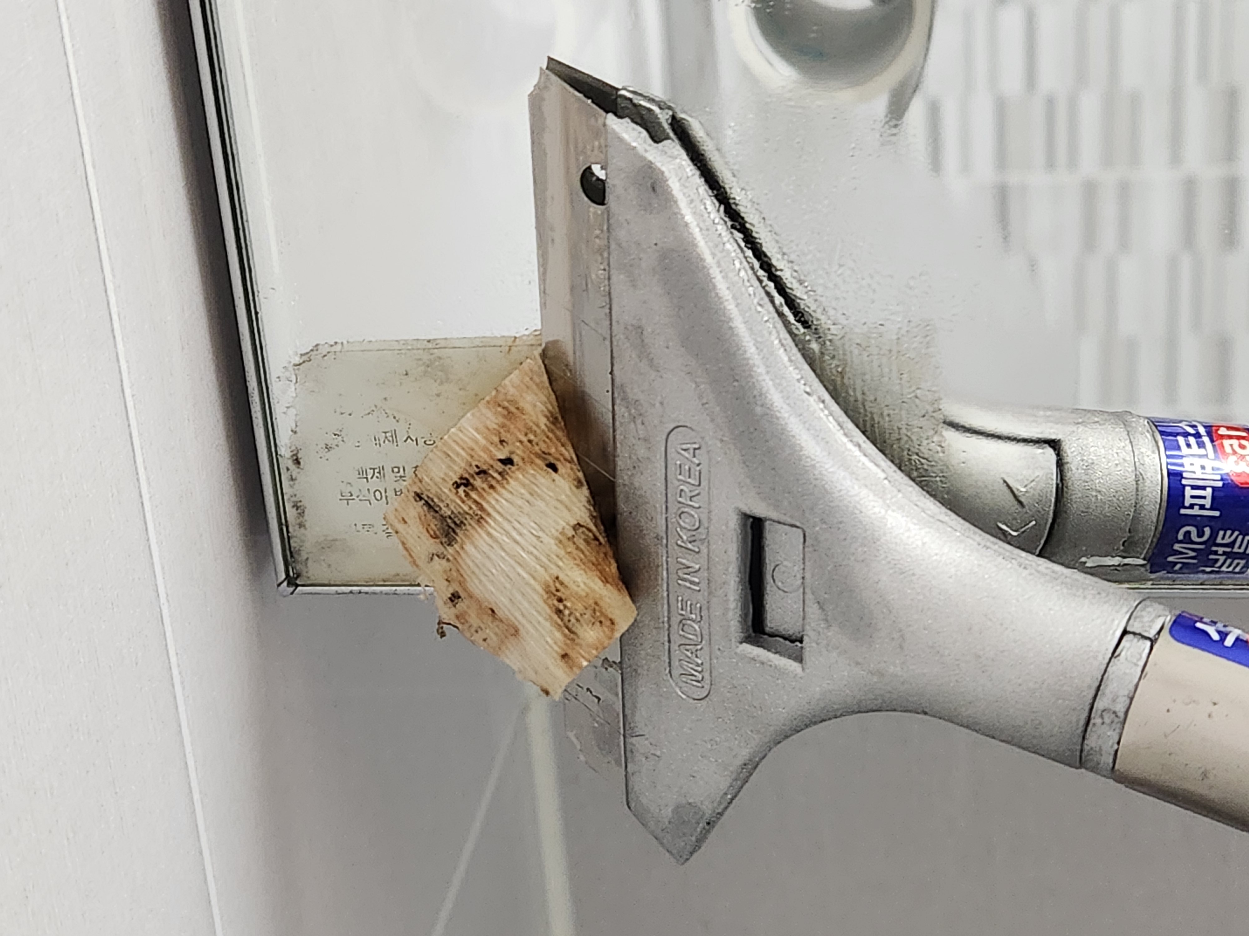 틈 사이에 스크래퍼 칼날 부분을 살짝 넣어주고