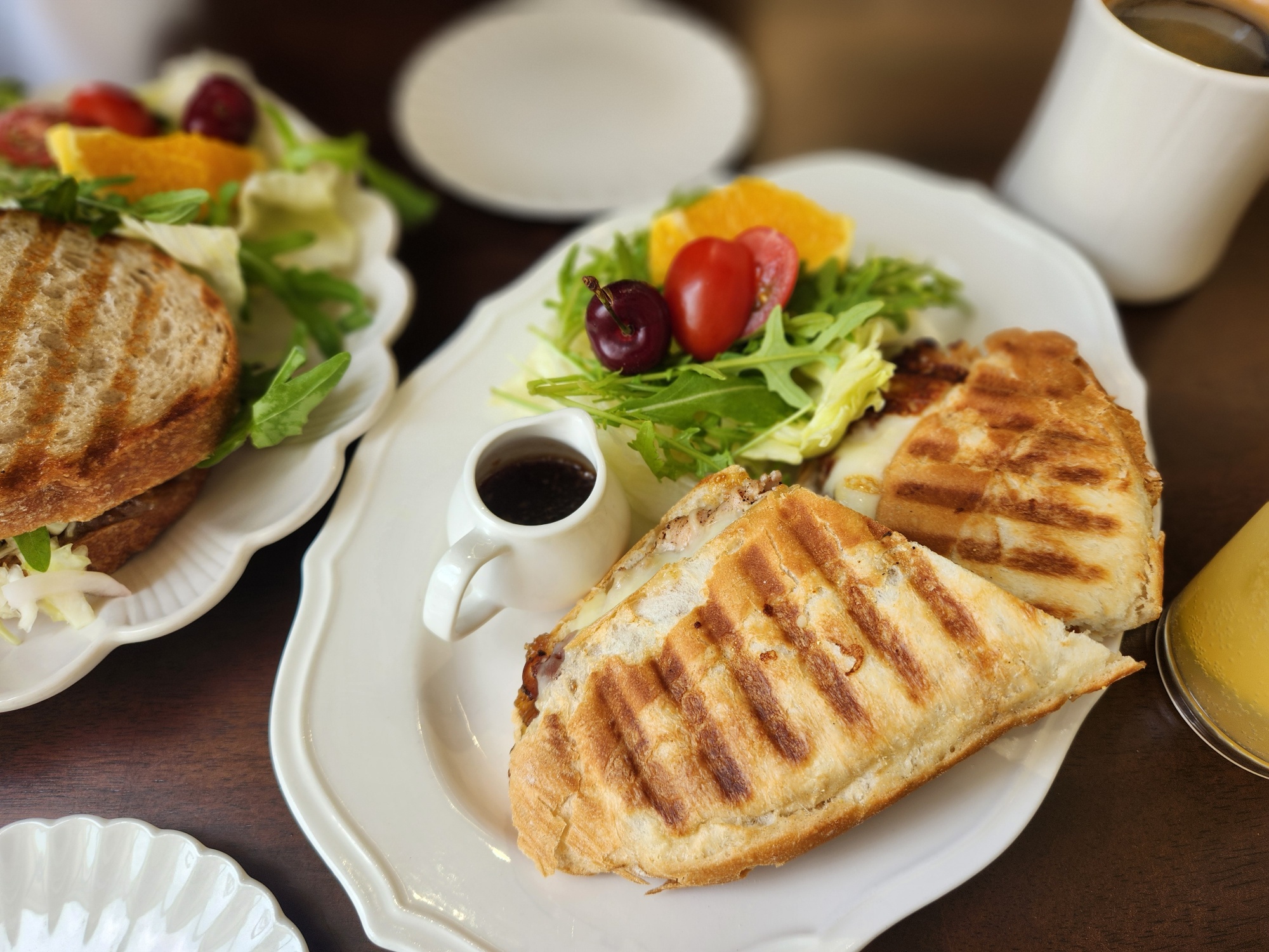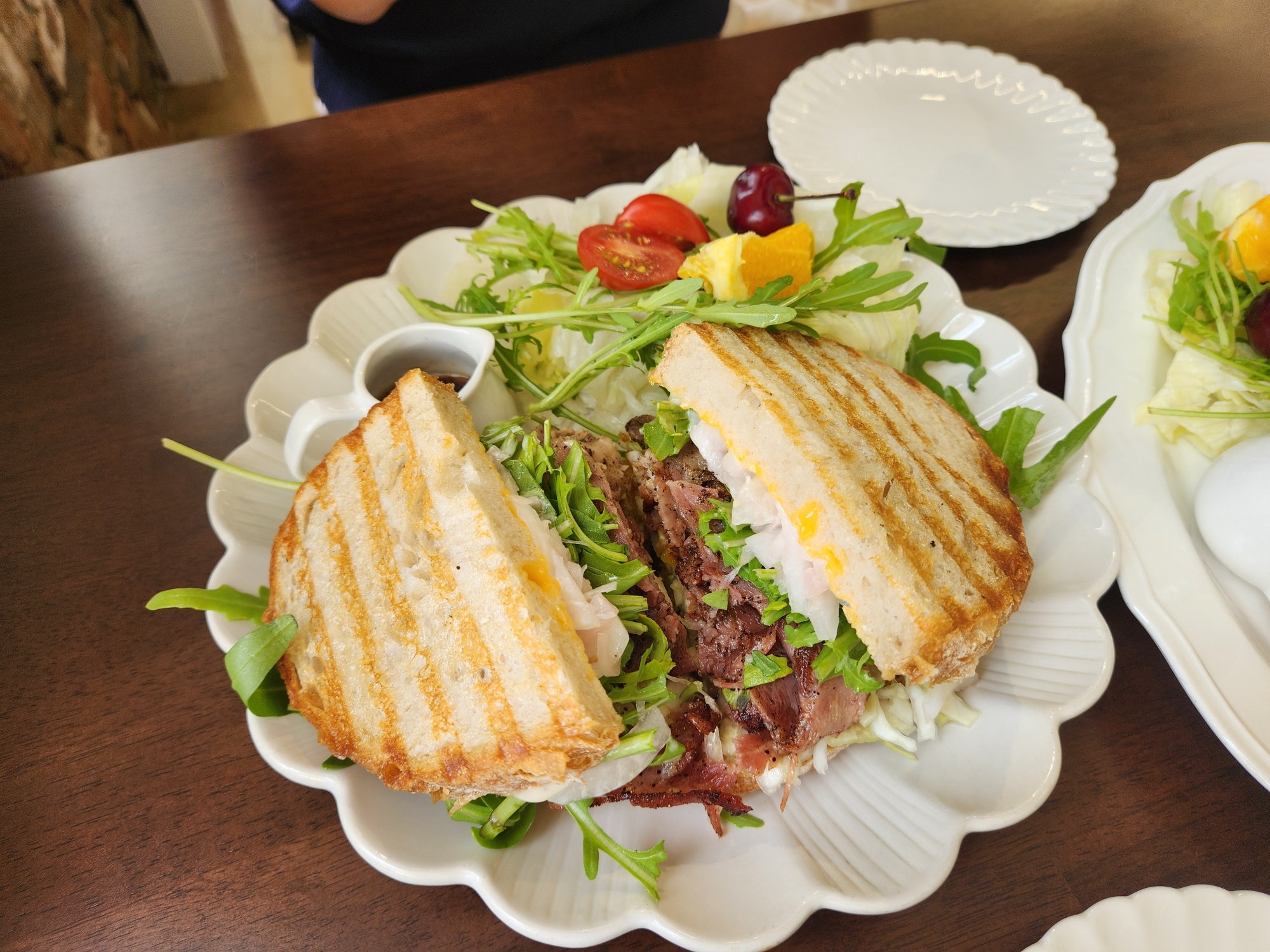 빵 가장자리가 딱딱해서 잘 안 잘리기 때문에 파니니처럼 예쁘게 먹기는 어렵습니다..ㅎㅎ