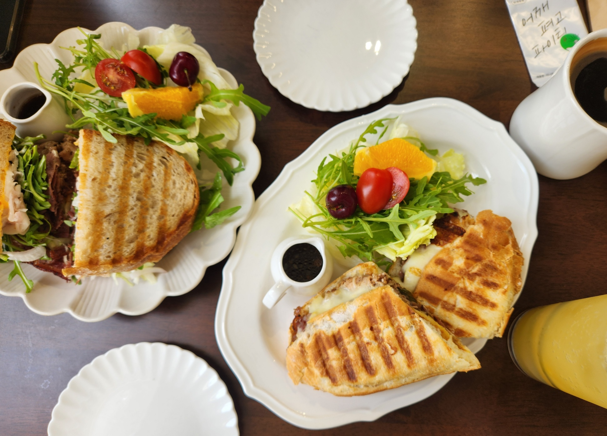 저희는 잠봉사워도우 샌드위치, 잠봉바게트 파니니, 아메리카노와 청귤에이드를 주문했어요.