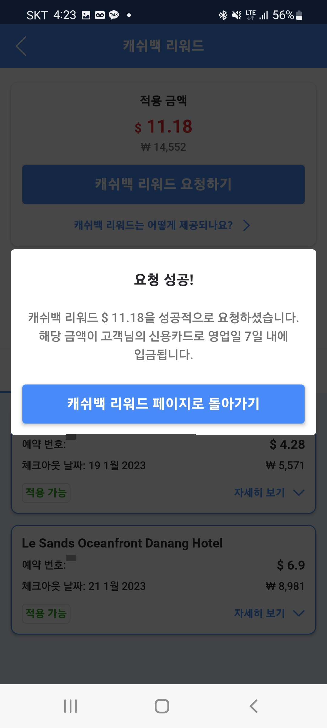 캐시백 리워드 신청이 되더군요