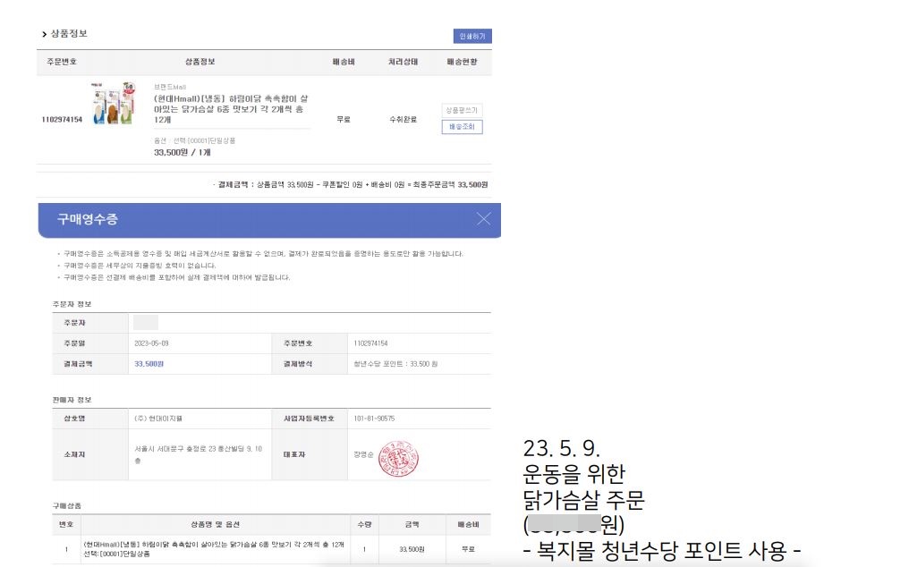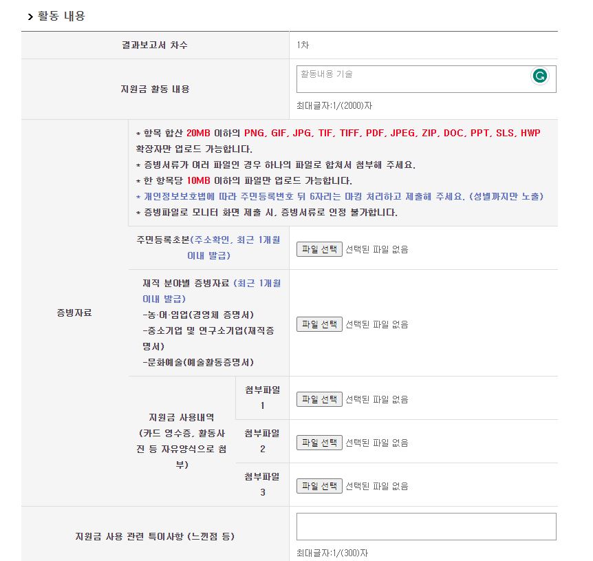 하단의 지원금 사용내역은 영수증, 사진 등이 필요하다고 하여