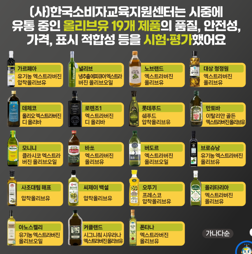 올리브유, 브랜드마다 가격 10배 이상 차이있어요 (사)한국소비자교육지원센터는 시중에 유통 중인 올리브유 19개 제품의 품질, 안전성, 가격, 표시 적합성 등을 시험·평가했어요[가르페아 유기
