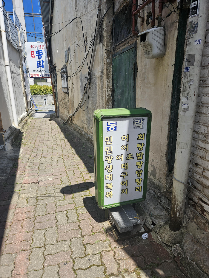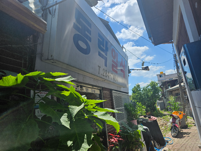 골목길 사이를 비집고 들어가니 보이는 동락일식 간판