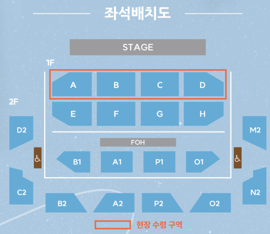 1층 앞쪽의 A, B, C, D 구역은 티켓 수령방법이 제한적입니다.