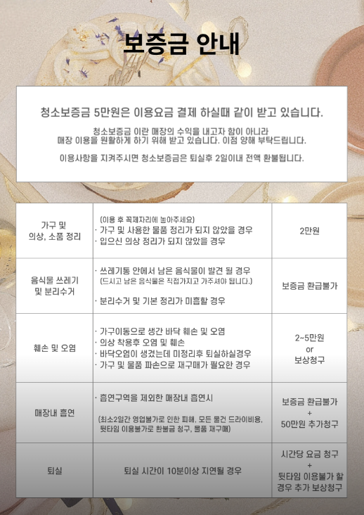청소 보증금이 5만원이 있기 때문에, 문제없이 다시 돌려받으려면 정리정돈을 잘하고 안내사항을 준수하시는 게 좋겠죠?