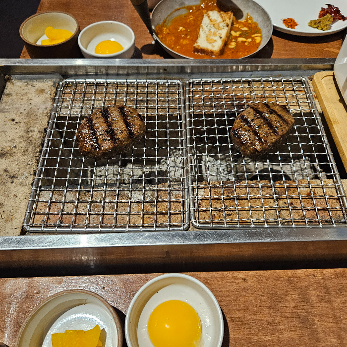 자 함박스테이크가 나왔습니다. 함박스테이크가 식지 않도록 1개씩 잘 익혀서 불판 위에 올려줍니다.