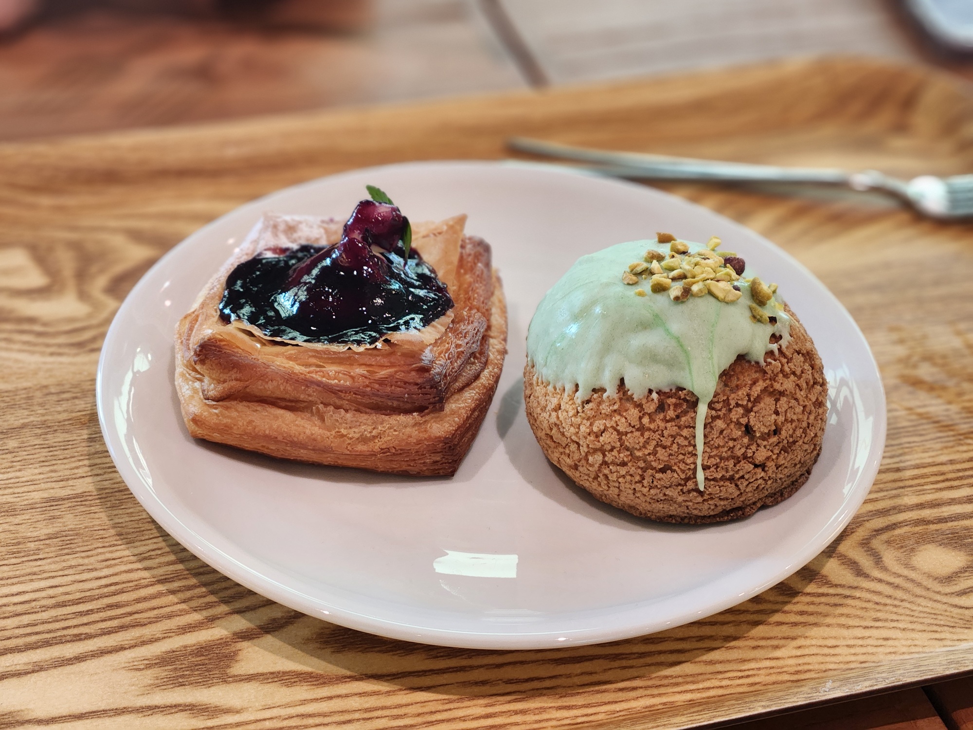 디저트는 블루베리 파이, 깨찰슈콘 피스타치오맛을 주문했습니다.