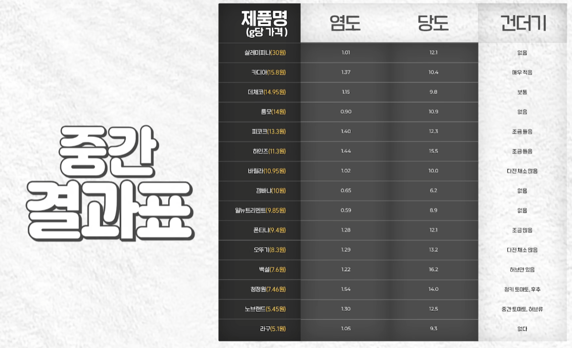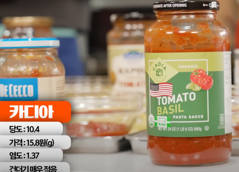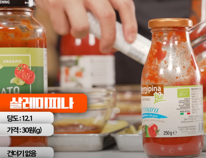 영상에서는 토마토소스 15종을 g별 단가, 당도, 염도, 건더기 양 등을 놓고 비교했습니다.