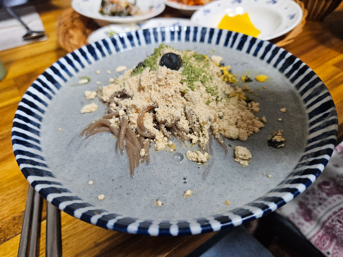 콩국수는 서리태공국수입니다. 검은콩으로 만든 걸쭉한 육수에 인절미 가루 등을 더해서 고소함이 더해집니다. 종종 들어있는 블루베리도 의외로 잘 어울리고 맛있습니다. 콩국수 좋아하시는 분이라면 추천