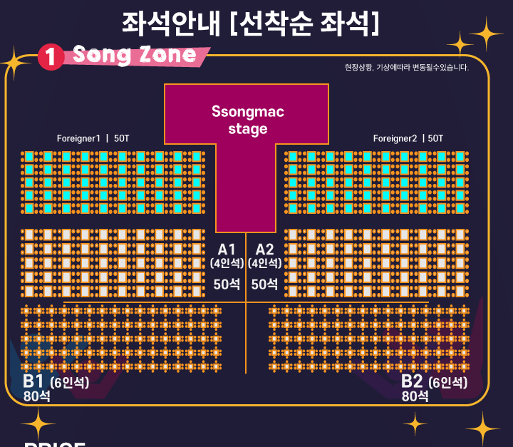 좌석 티켓을 구매하게 되면, 스테이지 주변의 테이블(4인석, 6인석)에 앉을 수 있으며 좌석은 선착순 좌석입니다. 시그니처 메뉴 중 하나(크림세우, 타코, 닭강정)를 고를 수 있으며 생맥주 5000cc도 제공합니다.