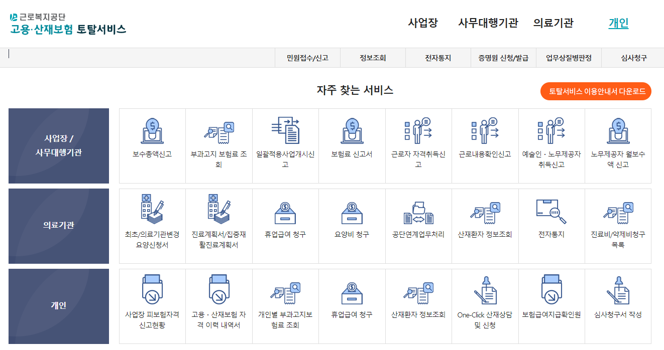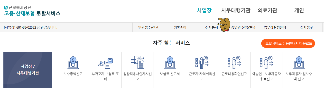 1. 근로복지공단 홈페이지 접속 > 고용산재보험 토탈서비스에 로그인합니다.