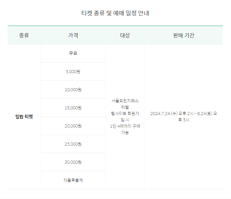 티켓 가격은 무료인 것부터 최대 3만 원까지 있어요.