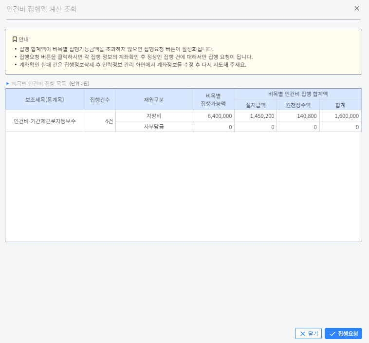 그렇다면 이렇게 인건비 집행액 계산조회 화면을 확인하실 수 있습니다.