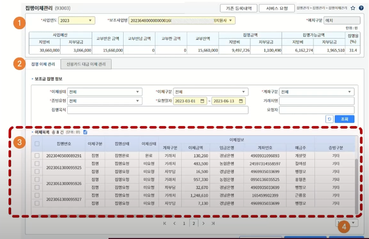 사업명을 선택하고 집행이체관리탭을 확인합니다.