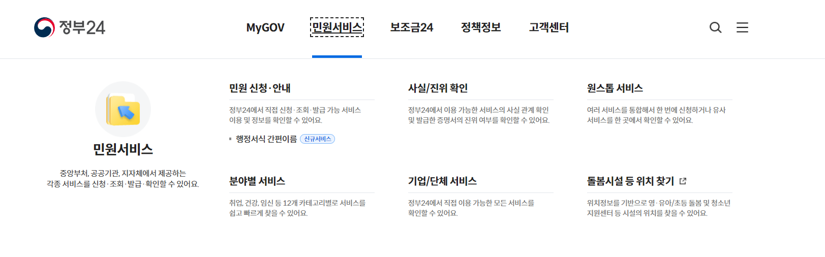 민원서비스 - 민원신청안내 클릭하여