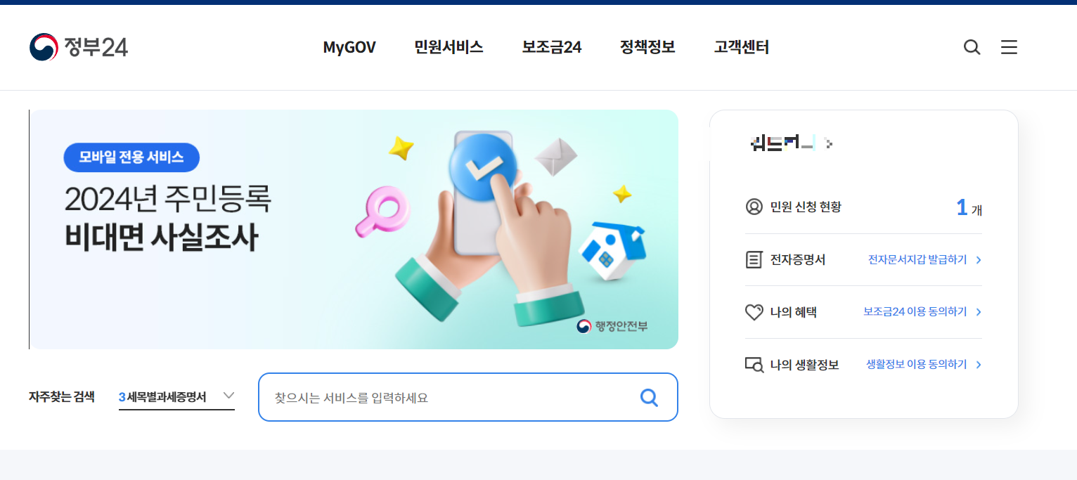 먼저 정부 24 홈페이지에 들어가 로그인해 줍니다.