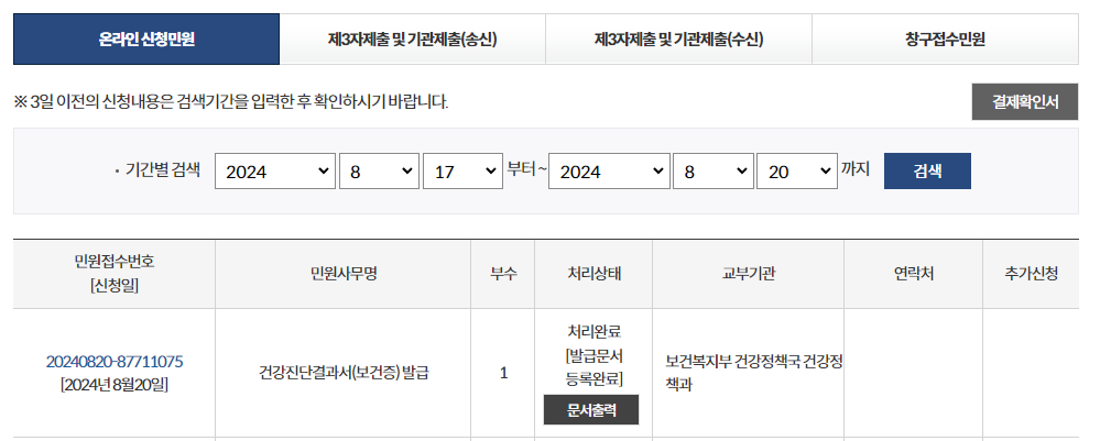 검사받은(접수) 날과 기관명을 확인 후