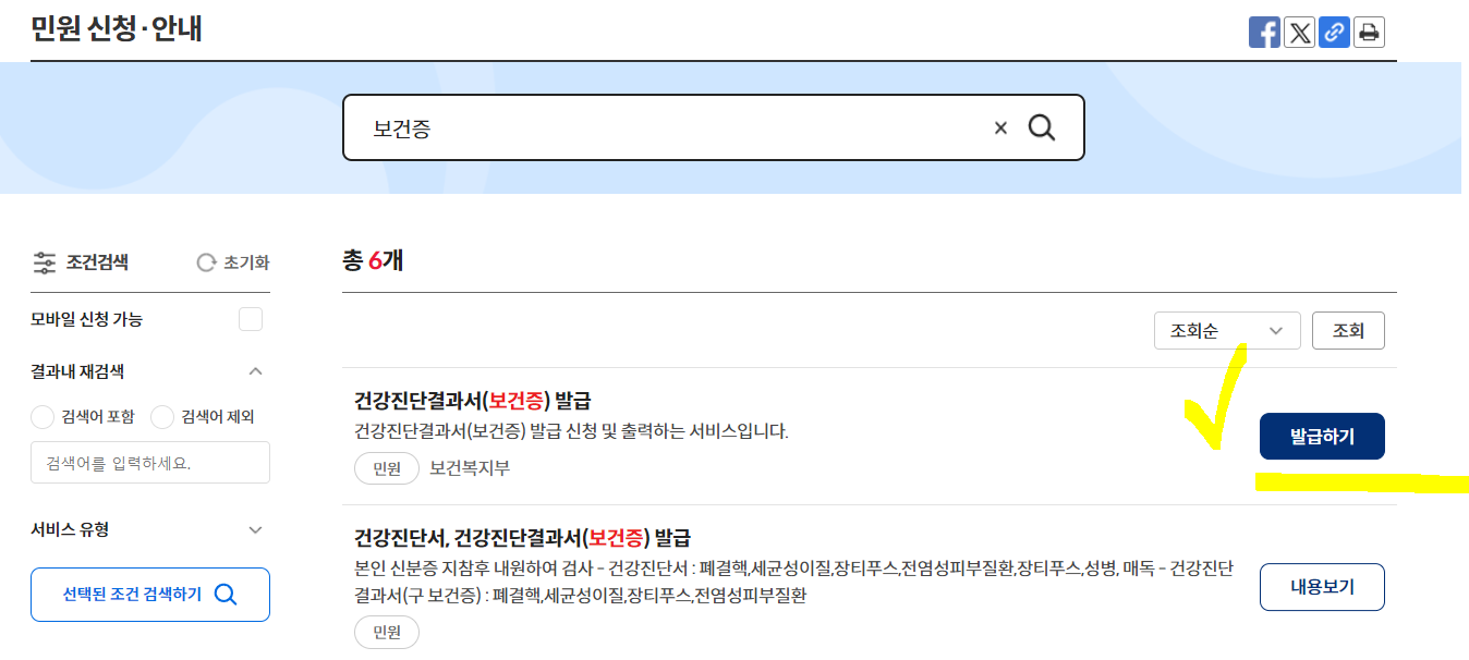 검색탭에서 보건증을 검색하시면