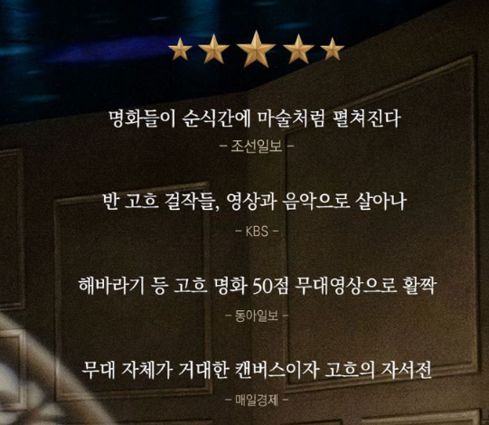 반고흐는 살아생전 단 한 장의 그림만 팔았지만, 현재는 전 세계인이 사랑하는 예술이 되었습니다. 이번 공연에서는 그의 명작들이 무대 위에서 최첨단 3D 프로젝트 매핑 기술로 생생하게 구현된다고 하니, 기대를 더합니다.