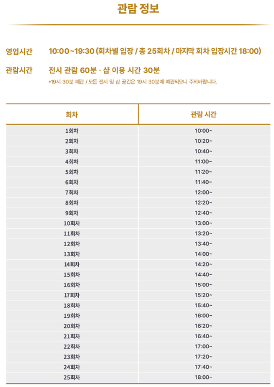 정국 전시회는 오전 10시부터 오후 7시 30분까지 운영하고 마지막 회차 입장시간은 오후 6시입니다.