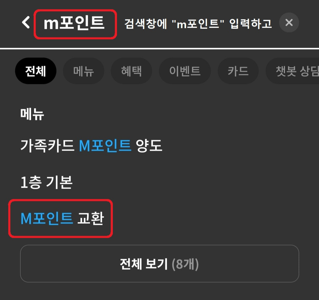 2. 검색창에 "m포인트"를 검색하면 아래 연관검색어에 "M포인트 교환"이 뜹니다.