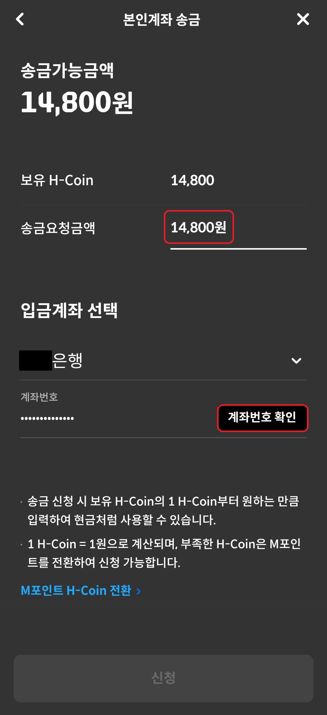 4. "M포인트 H-Coin 전환"으로 들어왔다면, 전환할 M포인트를 입력하고 [신청하기]를 누릅니다.