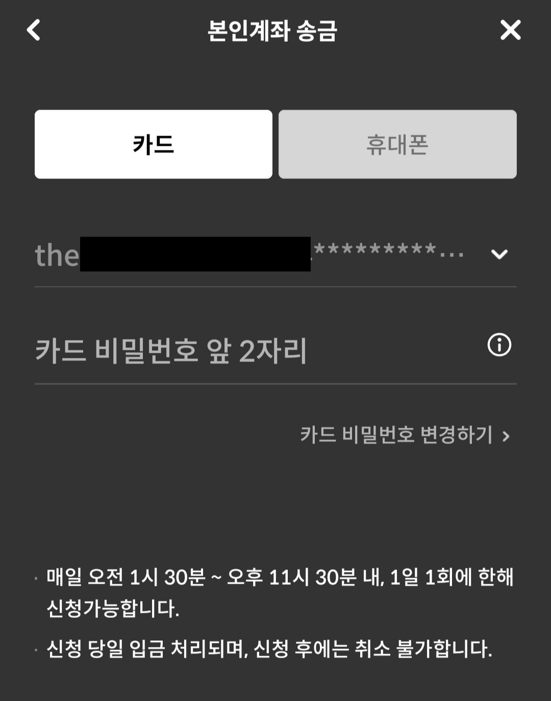 포인트를 계좌로 송금하는 것은 1일 1회만 신청가능하니 참고하시면 되겠습니다.