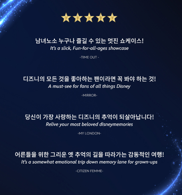 디즈니 특별전은 여러 개의 테마 갤러리로 구성되어 디즈니의 다양한 캐릭터와 작품, 창작 과정 등을 엿볼 수 있다고 합니다! 각 갤러리에서는 설치물과 비하인드 스토리를 통해 디즈니의 창의적 여정을 볼 수 있다는데요. 팬들이 좋아하는 애니메이션 속 명장면들을 재현한 공간도 있다고 합니다.