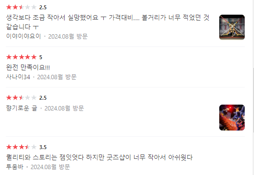 사이즈가 작고, 가격 2만 원 대비 아쉬움이 있었다는 후기 / 추가로 굿즈샵이 작은 것이 아쉽다는 후기도 있네요.