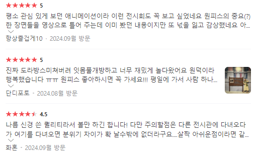 원피스 애니메이션의 의미 있는 부분들을 재현해 전시 보는 내내 기억이 새록새록 돋는다는 후기들을 보니 원덕들의 마음을 자극하는 전시임에는 틀림없는 것 같습니다. 방문하시는 분들은 해당 내용을 참고하시어 고민하시면 좋을 것 같습니다 :)
