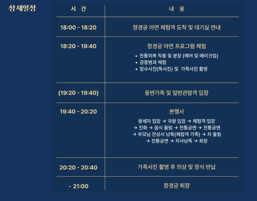 창경궁 야연은 부모님 중 1분이 체험자로 직접 참여하고, 가족들이 관람객이 되는 프로그램이라고 합니다.