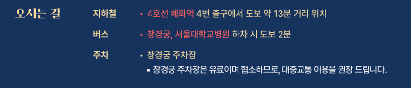 자차를 이용하는 경우 창경궁에 주차장(유료)이 있으나 공간이 좁아 대중교통을 이용하는 것을 추천합니다.