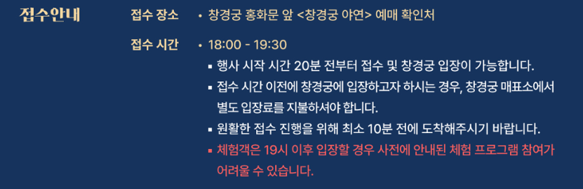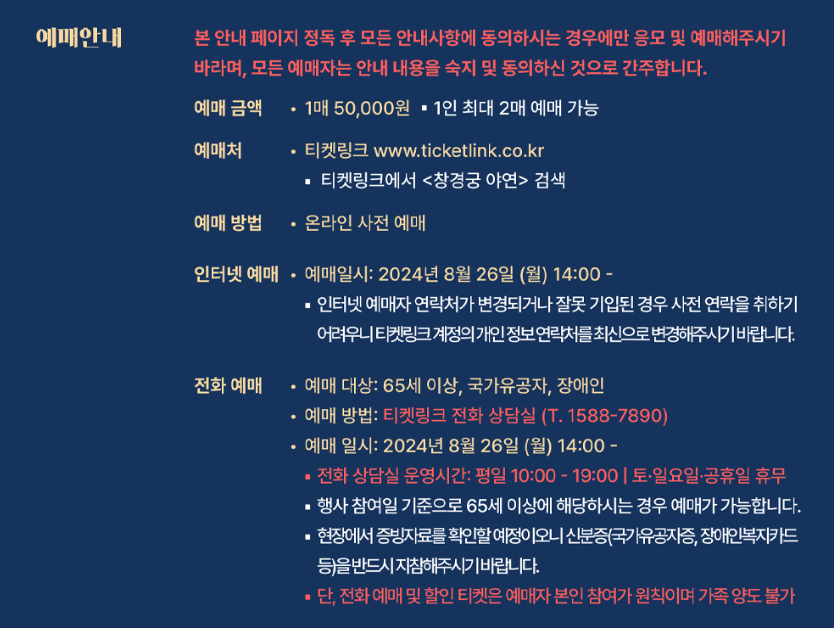역시나 사전 예약을 해야 하는데요. 티켓링크에서 "창경궁 야연"을 검색하면 예약 상세 페이지로 이동할 수 있어요.