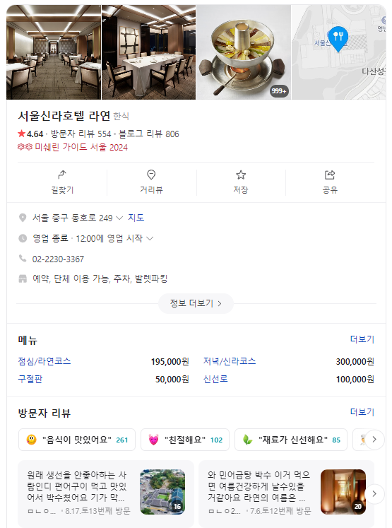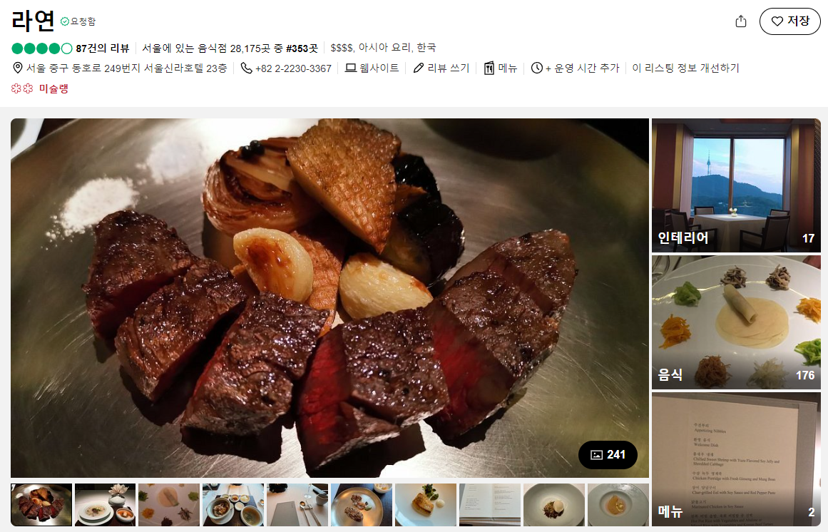 라연은 서울 신라호텔 23층에 위치한 고급 한식당입니다! 라연은 한식의 가치를 바탕으로 한 요리와 서비스를 제공하며, 고급스러운 분위기와 맛있는 음식이 인상 깊습니다.