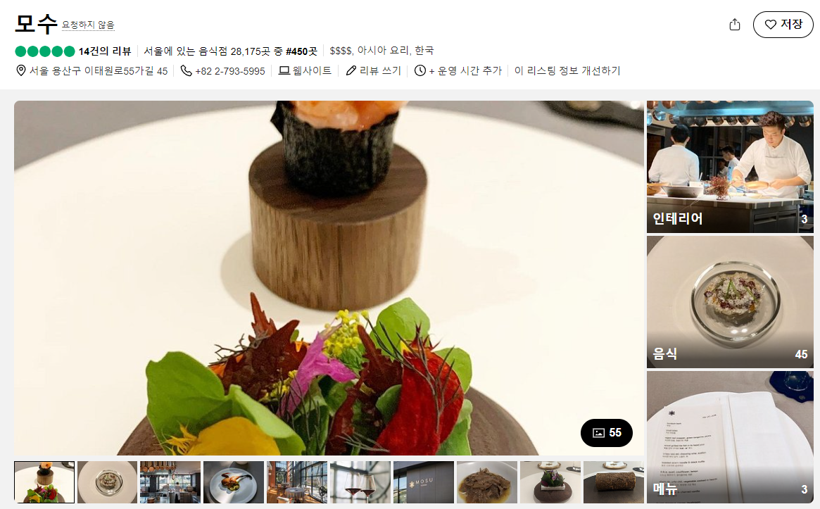 현재 한국에서 미쉐린 3스타를 받은 유일한 레스토랑 모수(Mosu)입니다. 모수는 서울 한남동에 위치한 식당인데요! 셰프 안성재가 이끄는 식당입니다. 모수는 한식을 기반으로 하지만 다양한 현대적 조리법 등으로 재해석된 요리를 제공합니다. 이곳에서는 계절마다 신선한 재료를 활용한 코스 요리가 제공되고, 메뉴는 자주 변화한다고 하네요