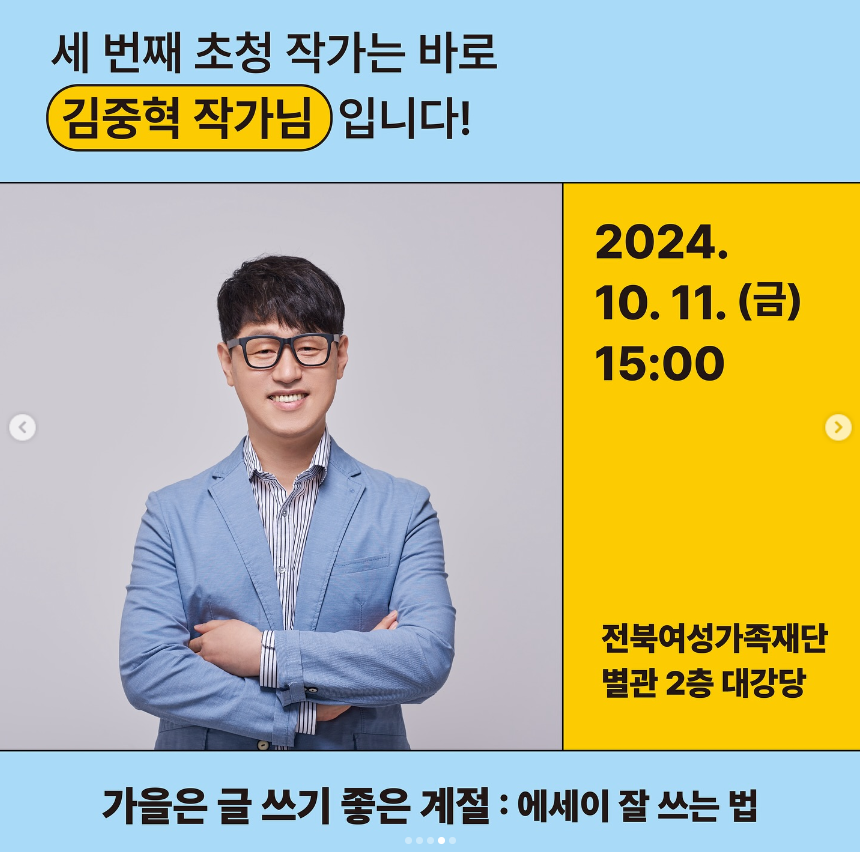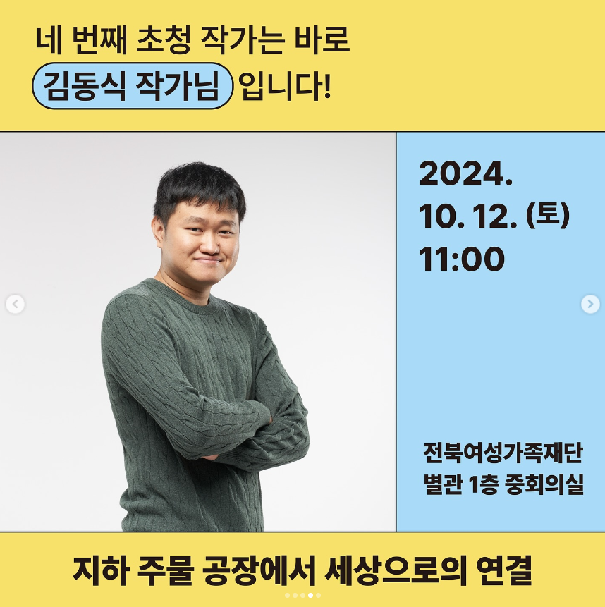 초청 작가 라인업으로는 이주혜작가님, 이승훈 작가님, 조예은 작가님, 김중혁 작가님, 이준호 작가님, 김동식 작가님, 김금희 작가님, 이소연 작가님까지! 다양한 주제들로 강연을 진행하며, 아직 사전모집이 진행 중이니 놓치지 않고 신청하시길 바랍니다 :) !