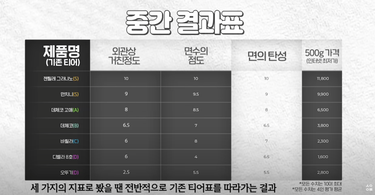 익히는 시간은 봉지에 표기된 시간으로 진행하며 50g씩 삶아서 먼저 외관상 구분하고, 점도나 탄성 가격 등을 먼저 비교합니다. 그 이후에는 면에 소스가 얼마나 잘 배어드는지 등 맛있는 면에 대한 맛 평가를 블라인드 테스트 하는 식으로 진행합니다. 파스타 종류는 시중에서 구할 수 있는 S급에서 ~ D급까지 7종을 가져와서 테스트했습니다