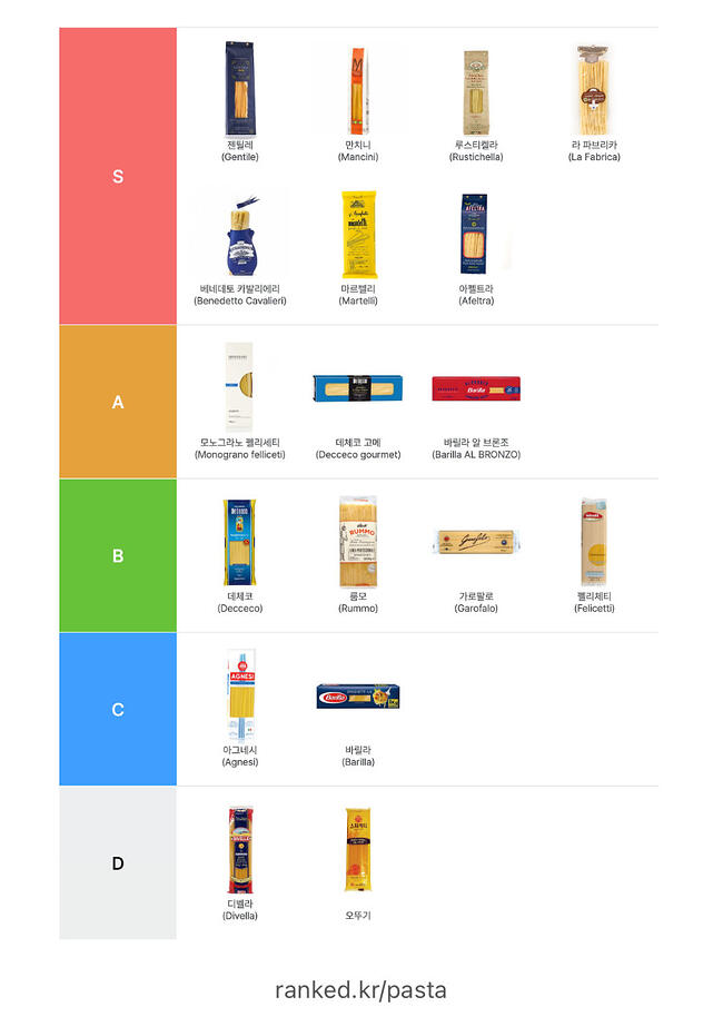 인터넷 짤로 떠돌아다니는 파스타면 브랜드별 계급도라는 것이 있다는 것을 알고 계셨나요!!? 다양한 커뮤니티에서 돌아다니는 그 짤..! 그 짤을 본 순간 S급면은 어떤 맛일까..? 궁금증을 지울 수가 없었는데요