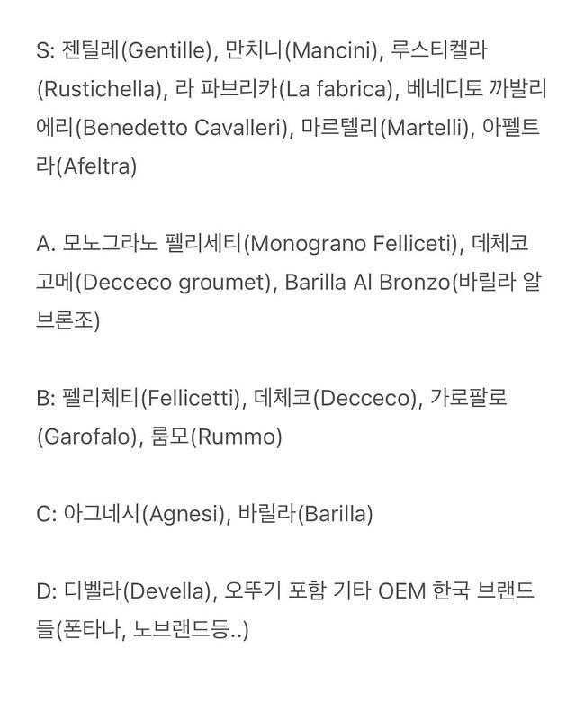 파스타면 계급도를 보고나서 직접 시중에 나온 파스타면들을 먹어보고 비교한 사람이 있었으니! 요즘 흑백요리사로 화제인 바로 승우아빠님 먼저 브랜드별 계급도 짤 먼저 살펴보겠습니다.
